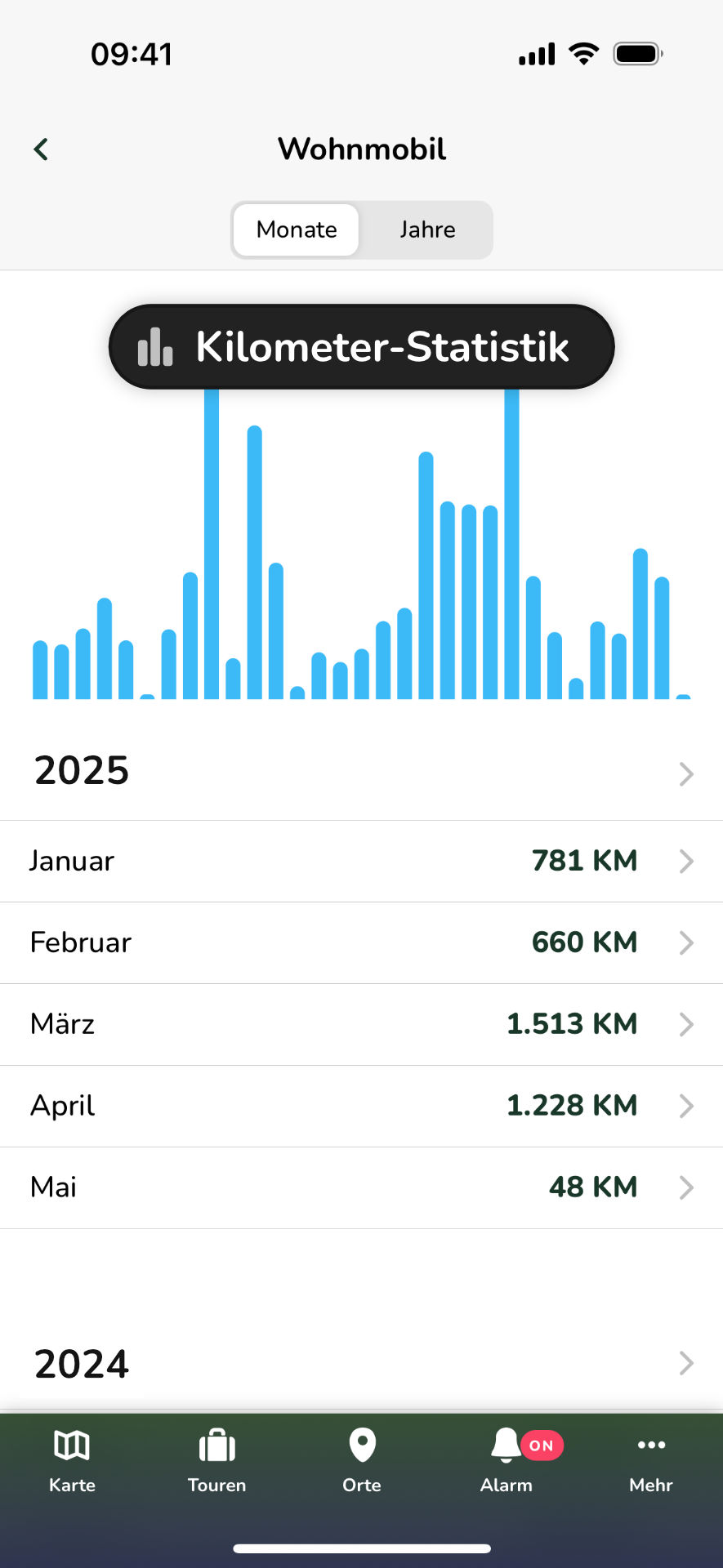 Du kannst ganz einfach in übersichtlichen Diagrammen sehen, wie viele Kilometer du an einem Tag, im Monat oder im Jahr gefahren bist. Genau wie die Routen, werden diese Daten endlos gespeichert.
