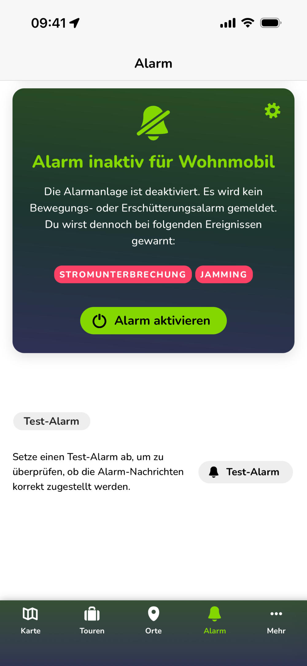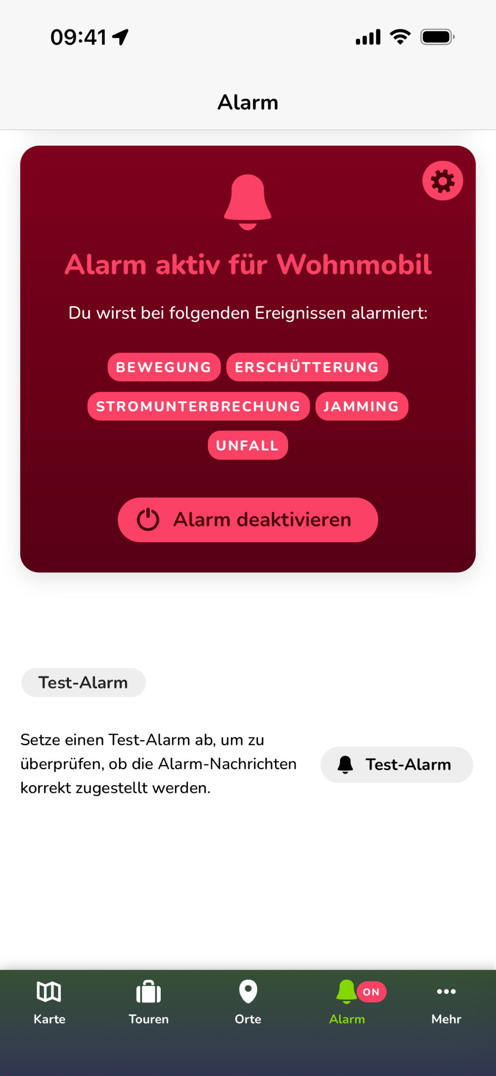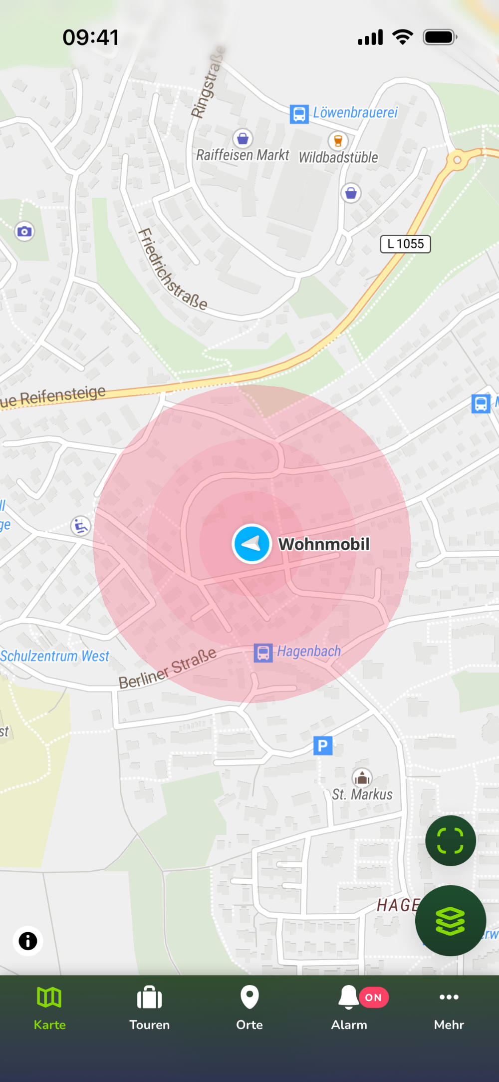 Ist der Bewegungsalarm aktiviert, sieht du außerdem auf dem Reiter "Karte" einen roten Kreis um den Standort deines Wohnmobils. Dieser stellt den eingestellten Radius dar, bei dessen Verlassen ein Alarm ausgelöst wird.