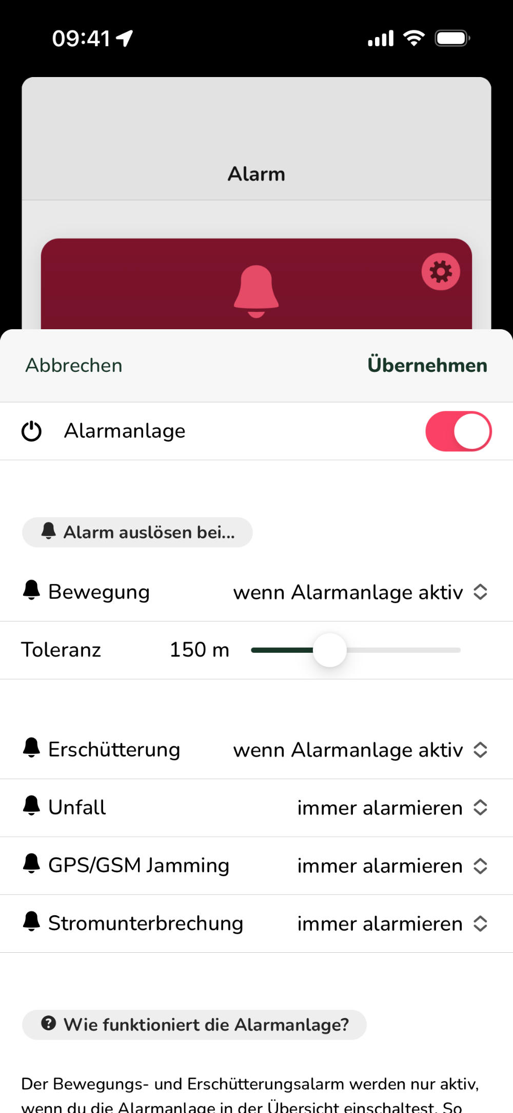 Der Bewegungsalarm warnt dich, wenn sich dein Fahrzeug unerlaubt vom Parkplatz entfernt. Dieser Alarm löst aus, wenn folgenden drei Bedingungen gleichzeitig erfüllt sind: