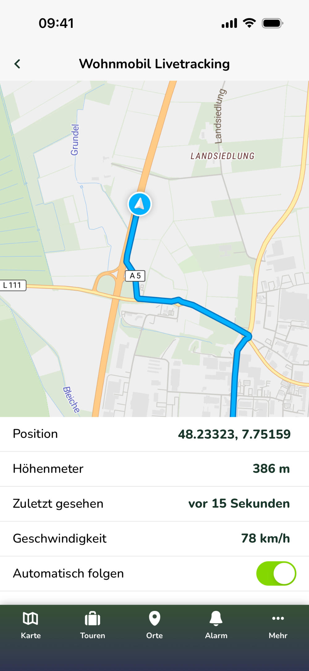 Mit Hilfe der Live-Tracking Funktion kannst du die aktuelle Fahrt deines Wohnmobils live nachverfolgen. In dieser Ansicht aktualisiert sich die Position auf der Karte alle 5 Sekunden automatisch.