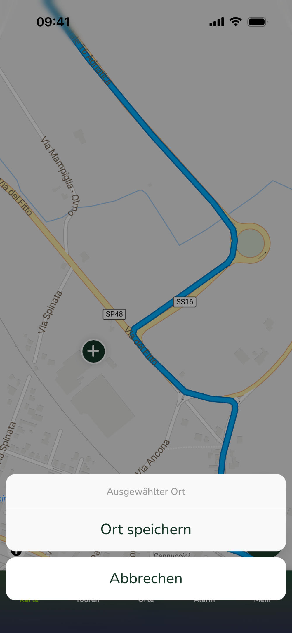 Um einen Ort schnell und einfach zu erstellen, kannst du überall auf der Karte lange Tippen und halten. Es erscheint die Option "Ort erstellen". Tippe diese Option, um zur Eingabemaske für den neuen Ort zu gelangen, an dem die gewählte Position bereits voreingertagen ist.