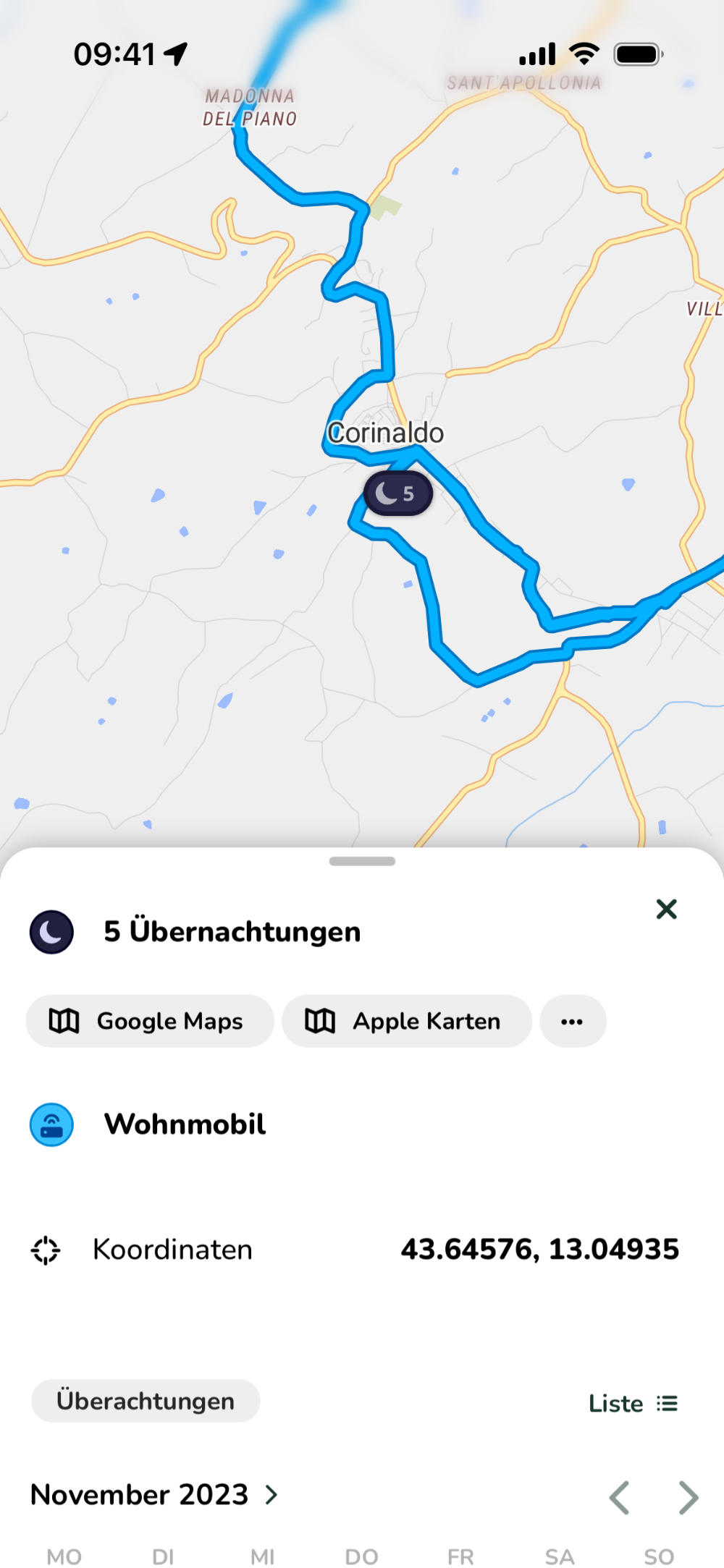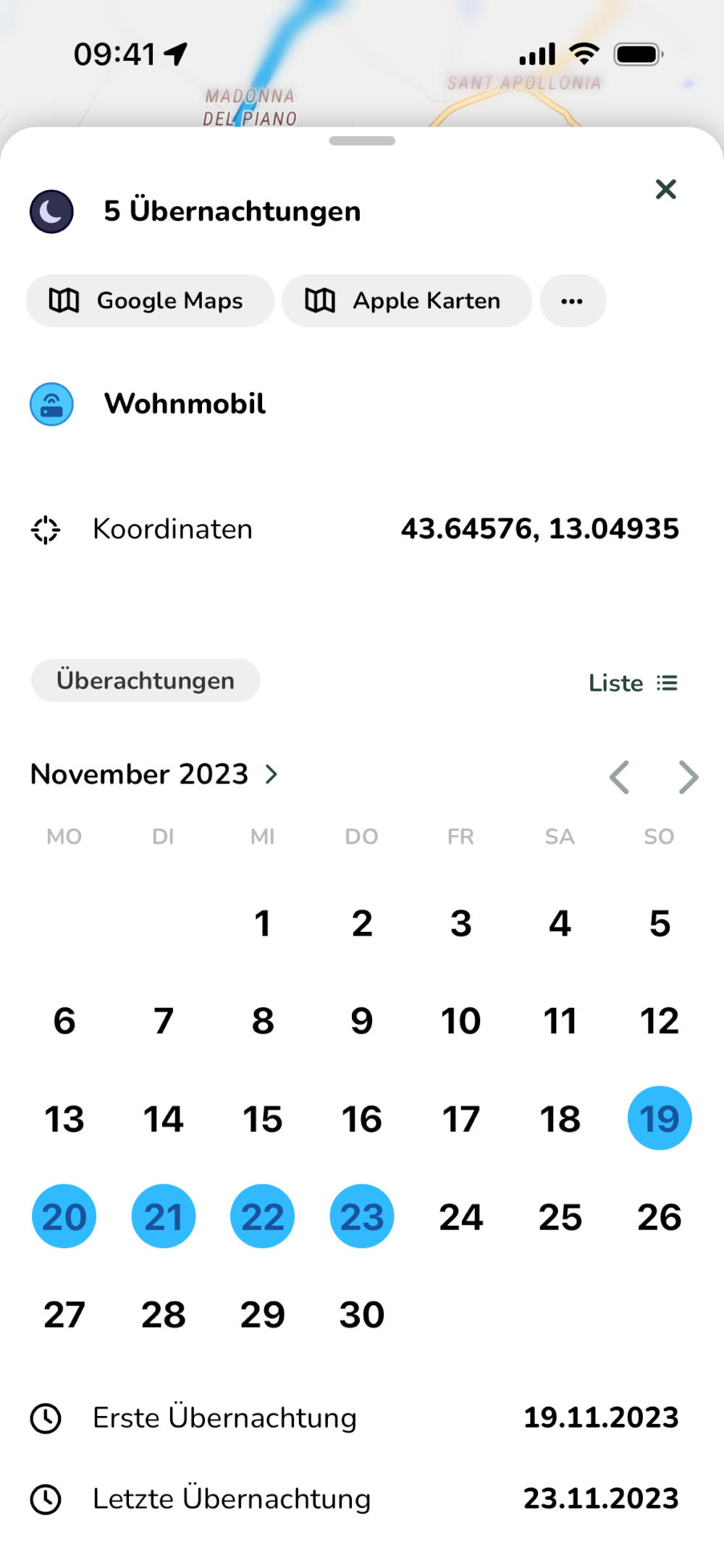 Durch Tippen auf einen Übernachtungsplatz öffnet sich ein Popup, das Details zum gewählten Übernachtungsplatz enthält. Wische das Popup nach oben, um alle Informationen zu sehen. Im Kalender sind alle Tage markiert, an denen du an diesem Platz übernachtet hast. Durch das Tippen der "Liste"-Schaltfläche kann diese Darstellung auf eine Listendarstellung umgeschaltet werden.