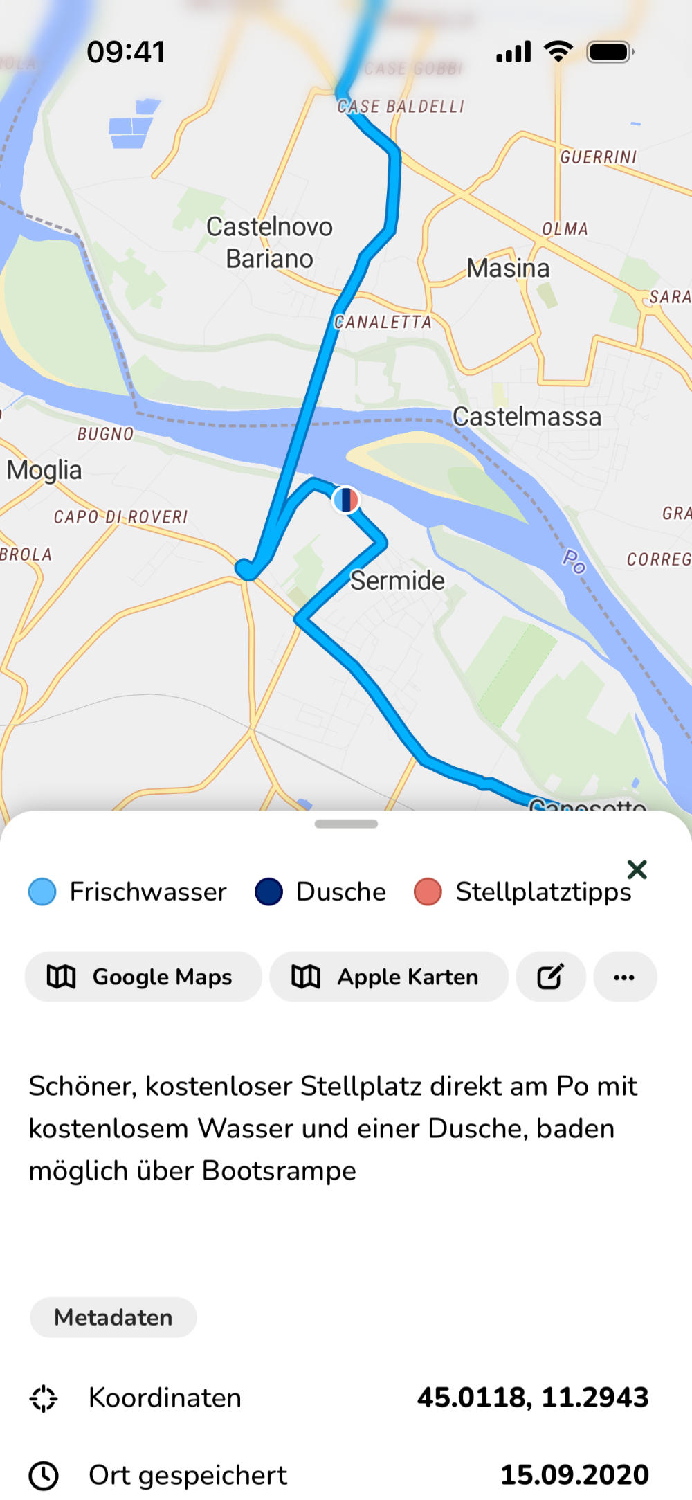 Durch das Tippen auf einen Ort öffnet sich ein Popup, das die Details zum gespeicherten Ort anzeigt. Es enthält die Kategorien, denen der Ort zugeordnet wurde sowie Titel, Beschreibung, Koordinate und das Datum, an dem der Ort gespeichert wurde.