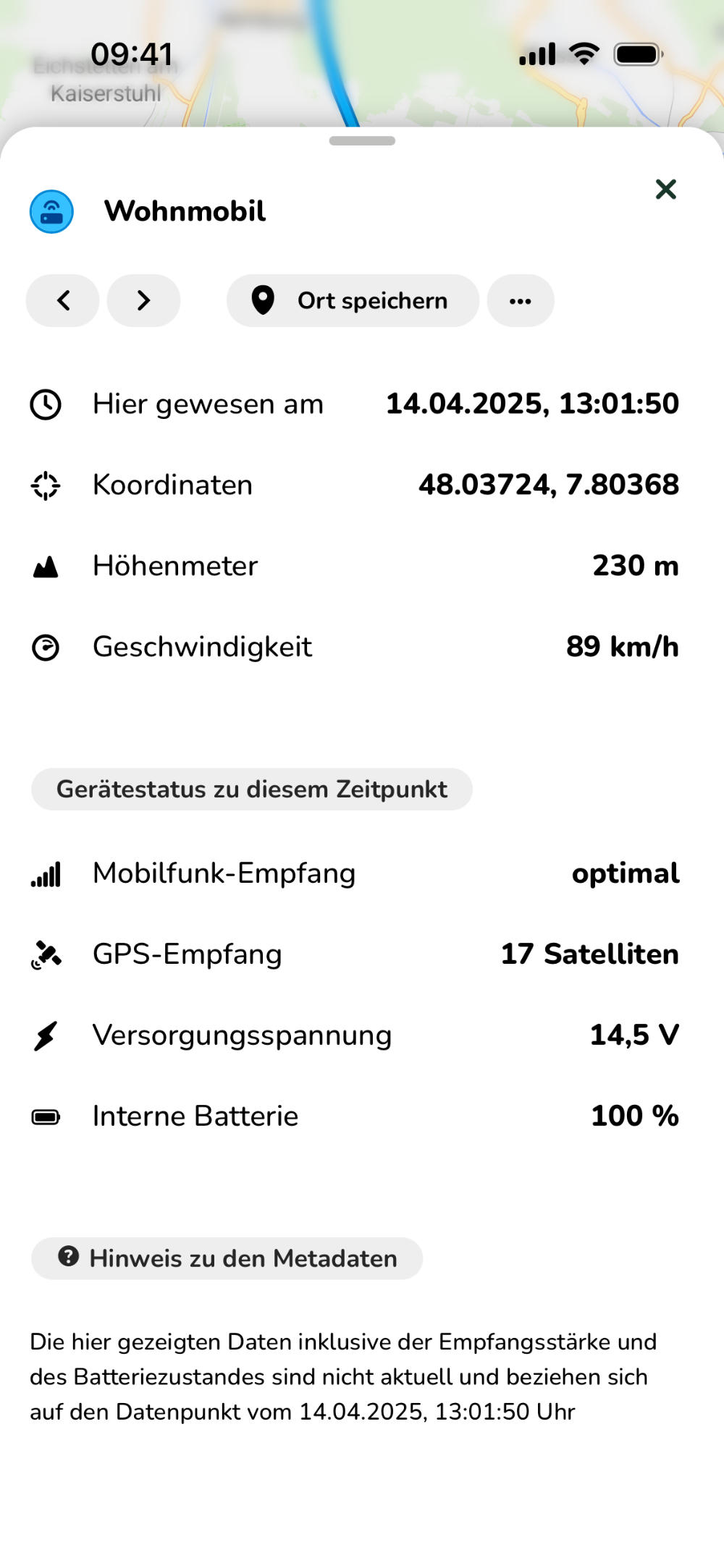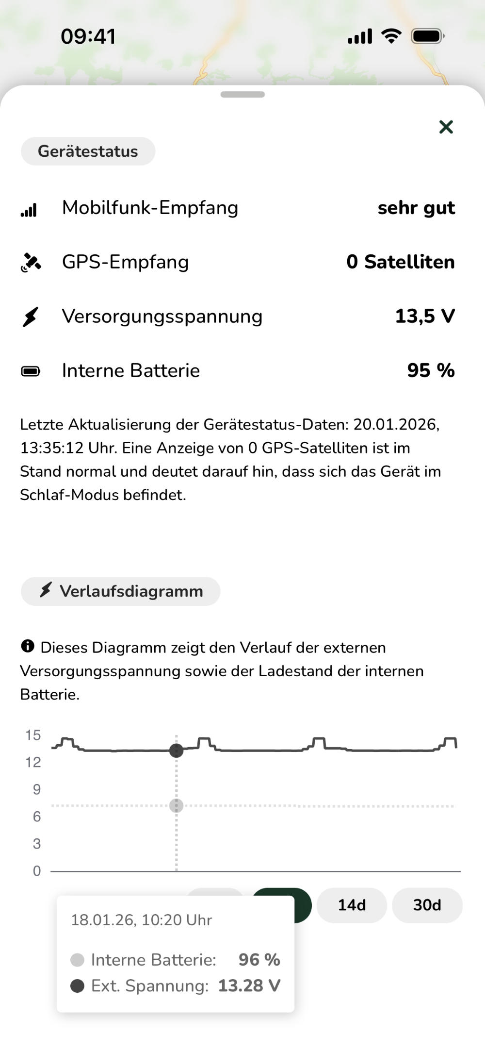 Ziehe das Popup nach oben, um Einblick in die aktuelle GPS und GSM Empfangsstärke sowie den Status der internen Batterie des Trackers und die extern anliegende Versorgungsspannung zu erhalten.