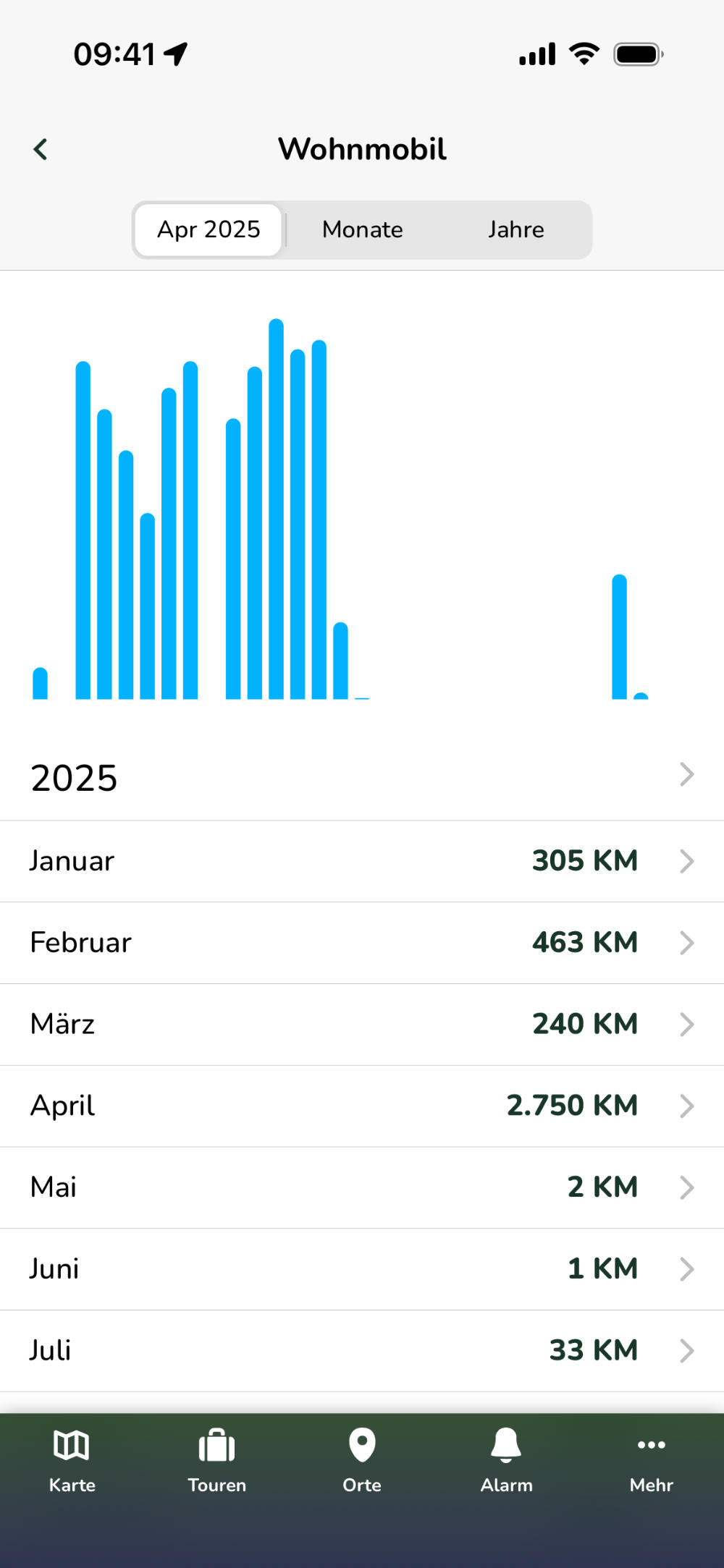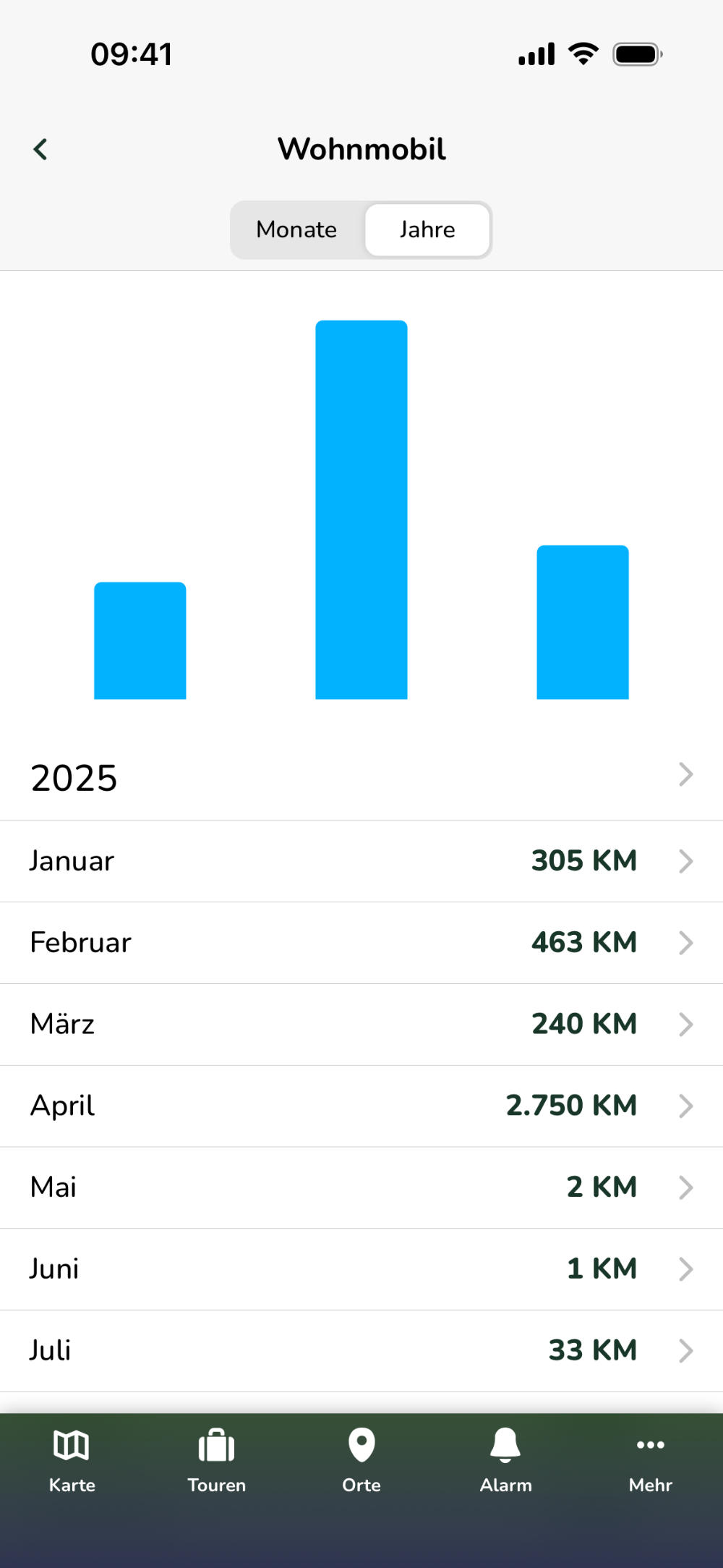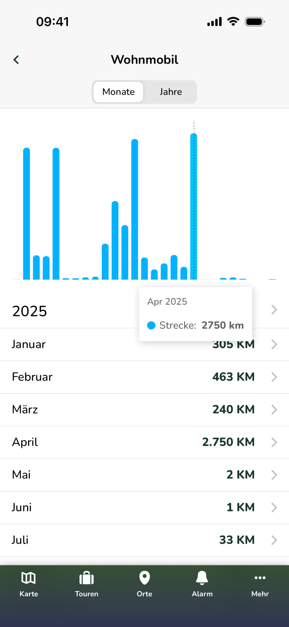 Wechsle zwischen der Ansicht "Monate" und "Jahre", um im Balkendiagramm entweder aufsummierte Kilometer von ganzen Monaten oder von ganzen Jahren zu sehen.