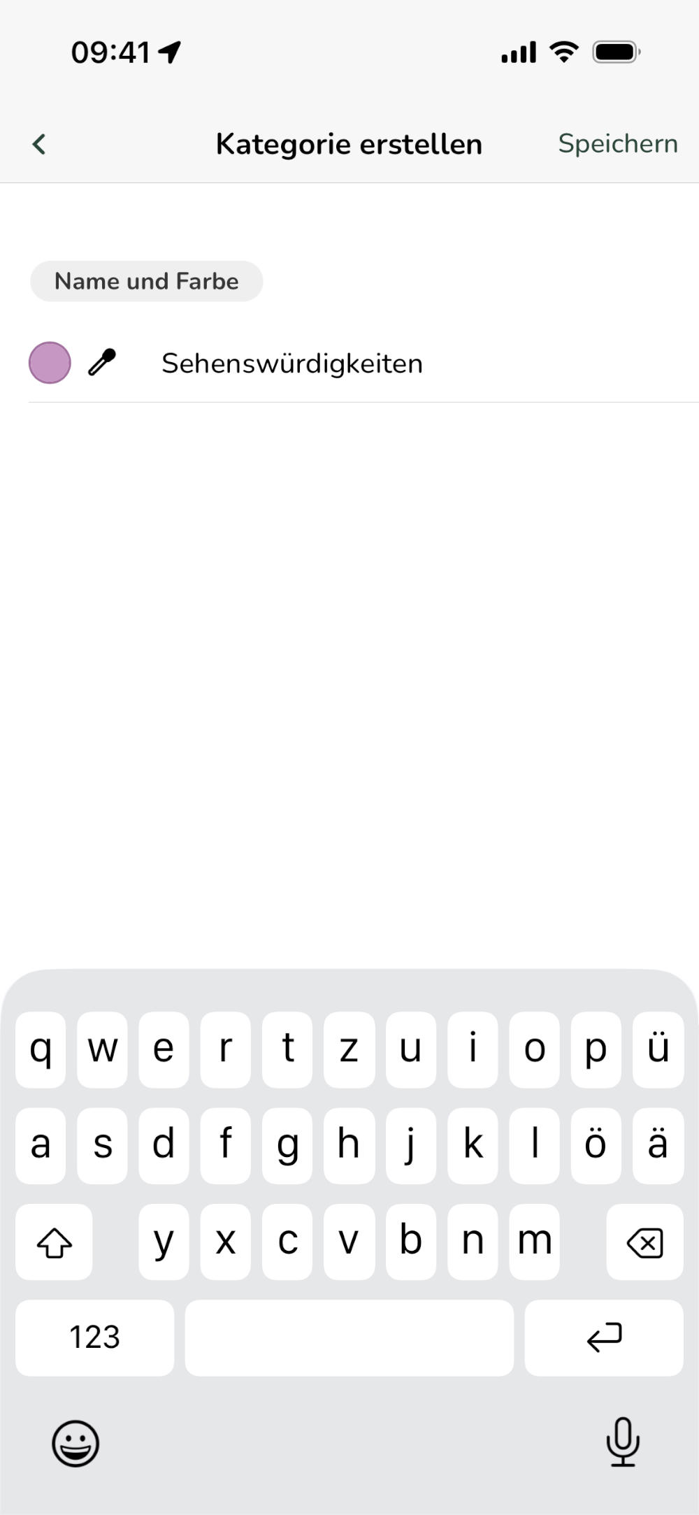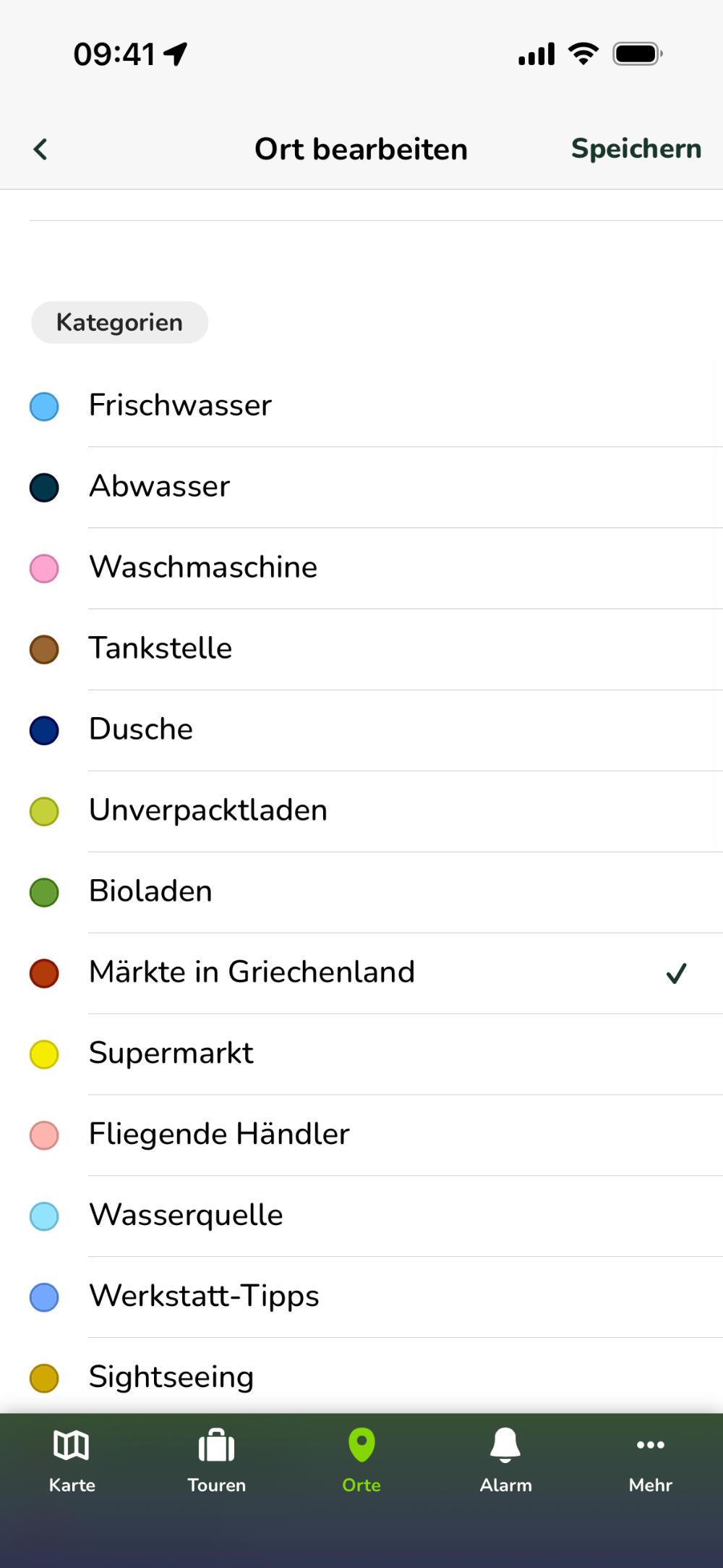 Gib der neuen Kategorie einen Namen und wähle eine Farbe aus. Du kannst deine Kategorien beliebig benennen, Beispiele für Namen sind: "Wasserversorgung", "Sightseeing", "Tolle Wanderungen" oder "Restaurants". Die gewählte Farbe wird später auf der Karte bei Orten sichtbar sein, die dieser Kategorie zugeordnet sind.