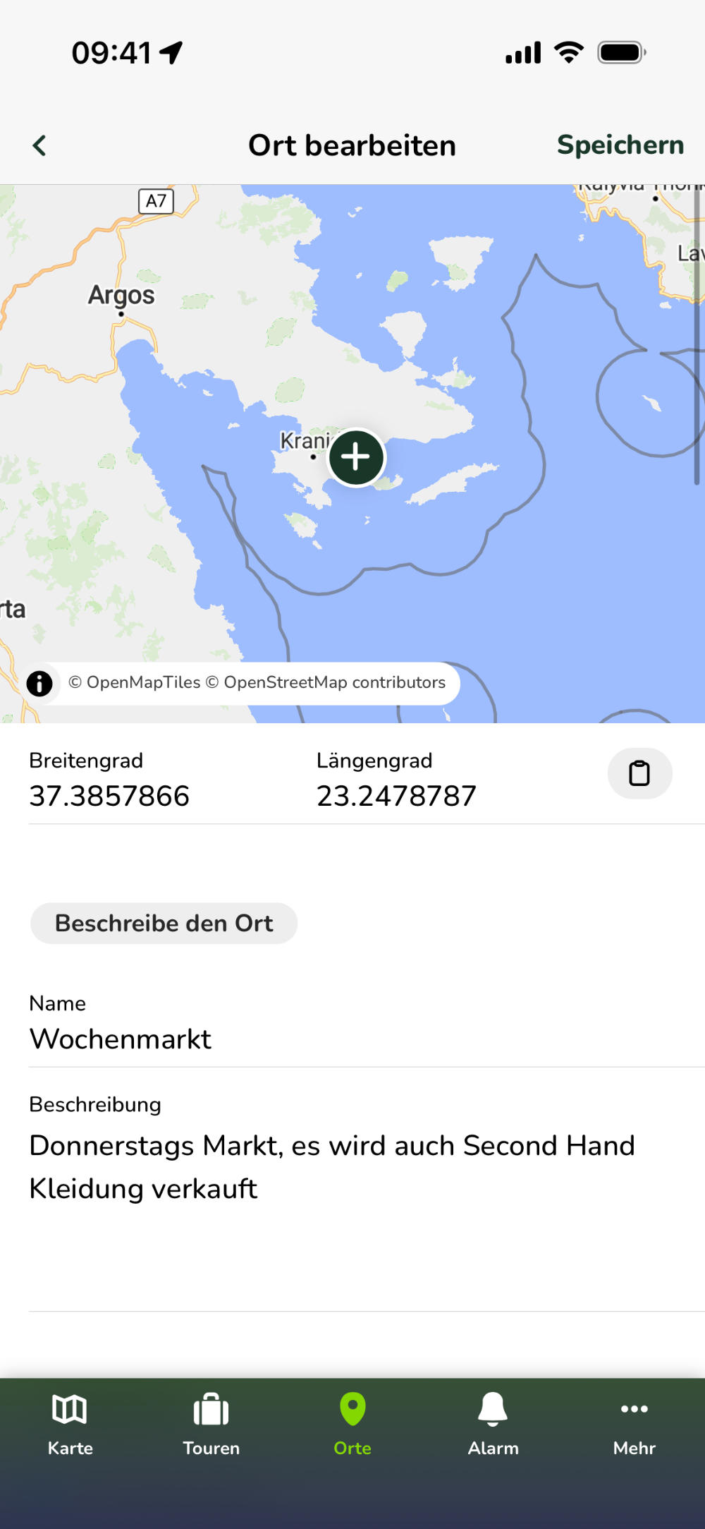 Wähle auf der Karte die Position des Ortes aus, den du speichern möchtest. Alternativ kannst du auch die Dezimal-Koordinaten des Ortes in die Eingabefelder für Breiten- und Längengrad kopieren. Wenn du die Koordinaten aus einer anderen App in einem passenden Format kopiert hast, kannst du sie über die Einfügen-Schaltfläche automatisch einfügen. Erlaubte Formate sind: