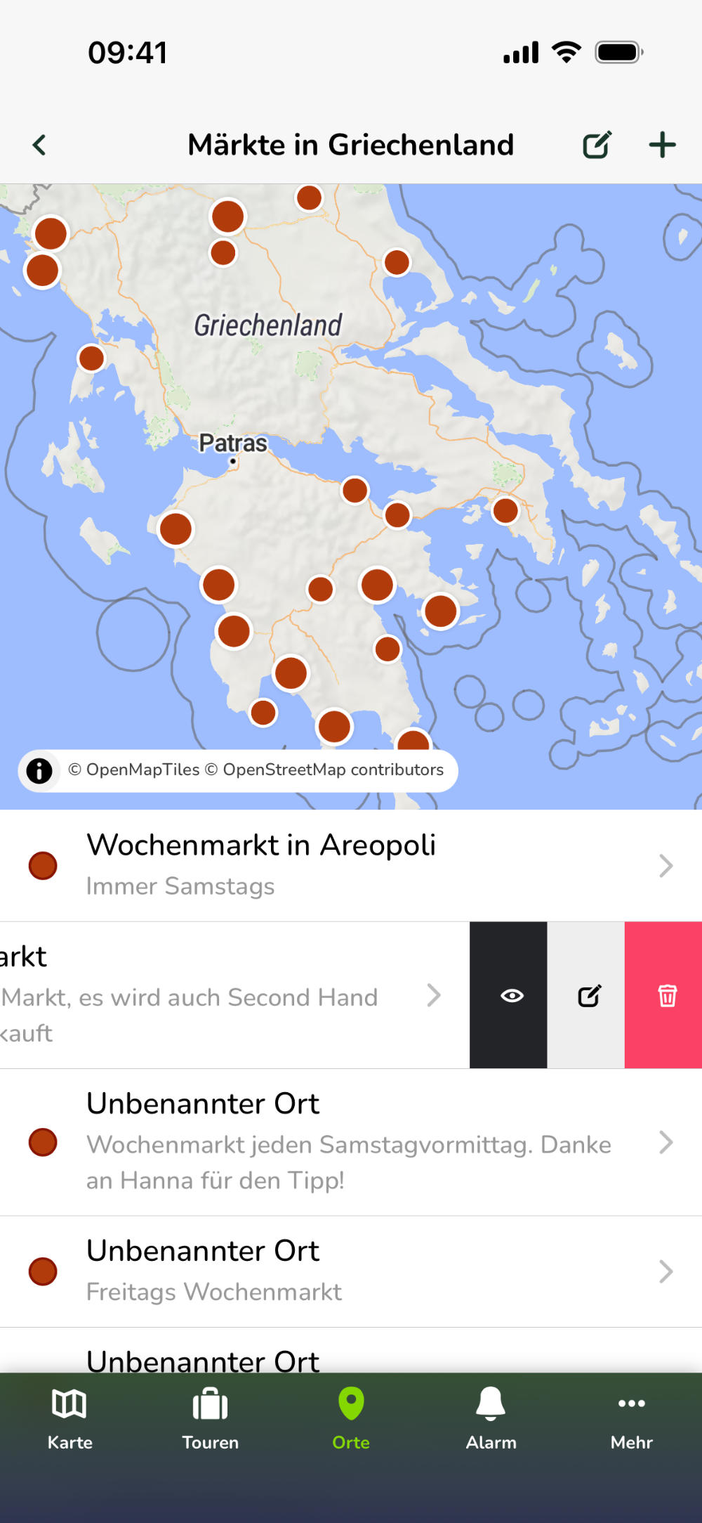 Tippe die graue Schaltfläche, um die Tour zu bearbeiten oder die rote, um sie zu löschen. Die schwarze Schaltfläche mit dem Auge-Symbol führt dich direkt in die Kartenansicht und zeigt den gewählten Ort an.