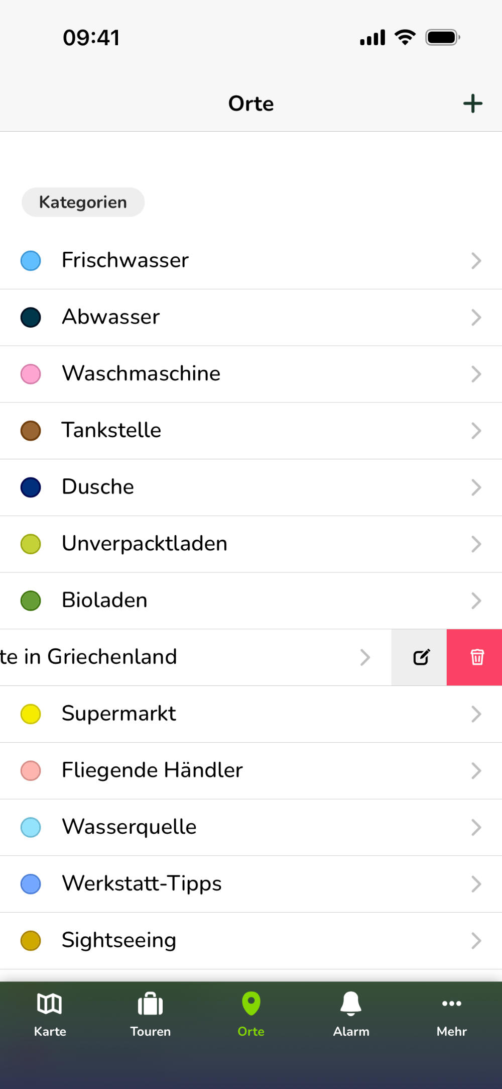 Sowohl die Kategorien als auch die Orte können in den Listen-Ansichten nach links gewischt werden. Es tauchen dann weiterführende Optionen zum Bearbeiten, Löschen und Anzeigen der Kategorien bzw. Orte auf.