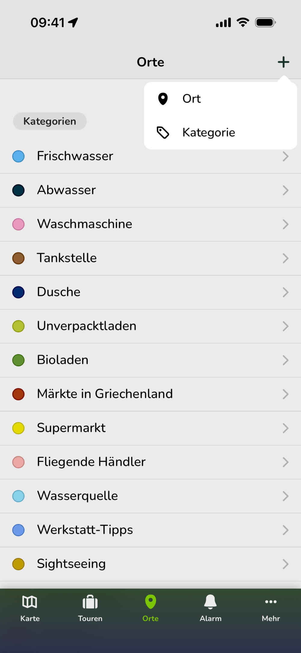 Tippe im Reiter "Orte" auf das "Plus"-Symbol 1 oben rechts und wähle "Kategorie", um eine neue Kategorie zu erstellen. Beachte, dass du mindestens eine Kategorie brauchst, um Orte erstellen zu können.