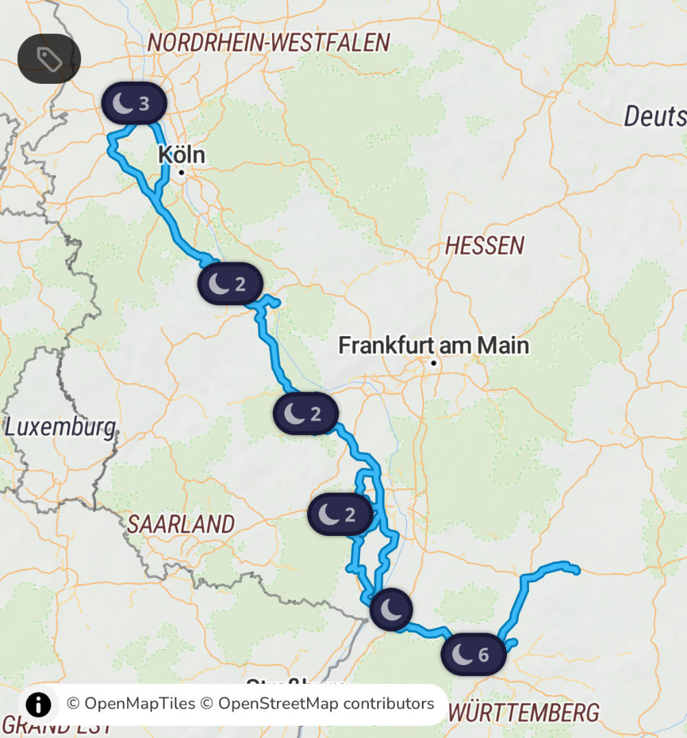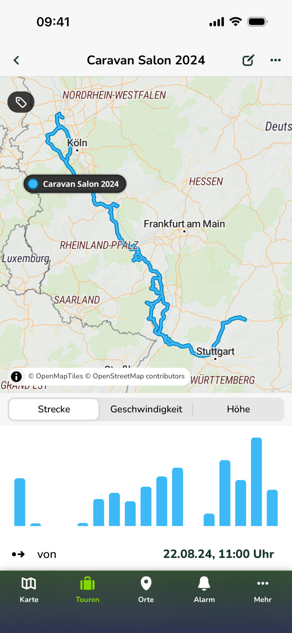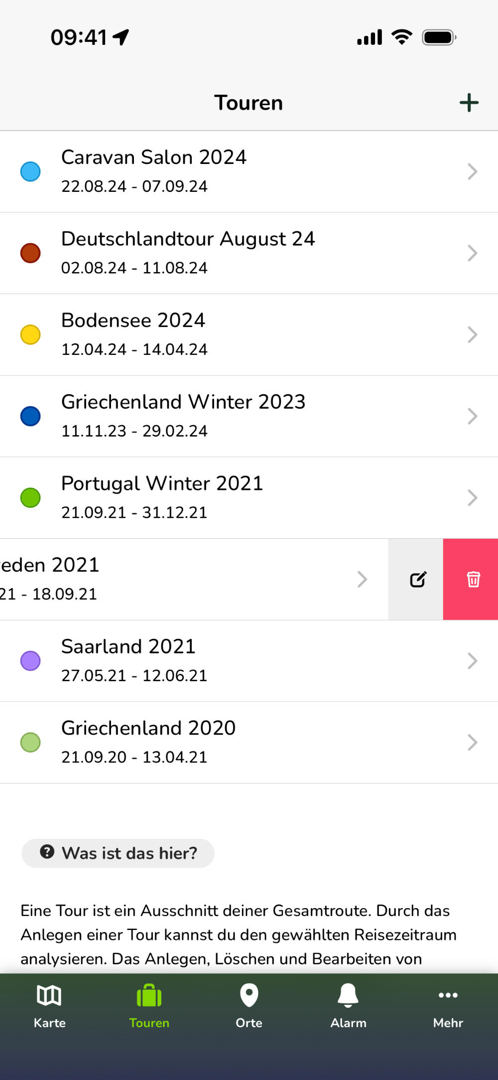 Eine Tour ist ein Ausschnitt deiner Gesamtroute. Durch das Anlegen einer Tour kannst du den gewählten Reisezeitraum analysieren. Das Anlegen, Löschen und Bearbeiten von Touren hat keinen Einfluss auf deine Routendaten.