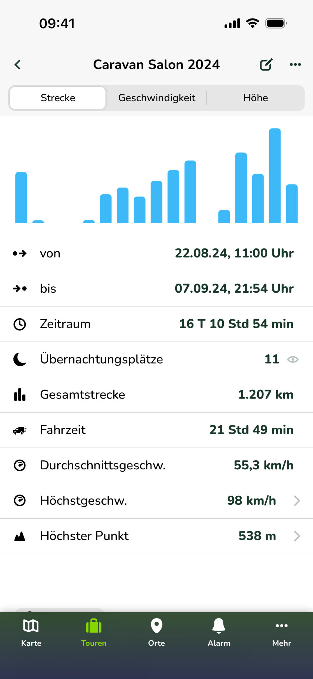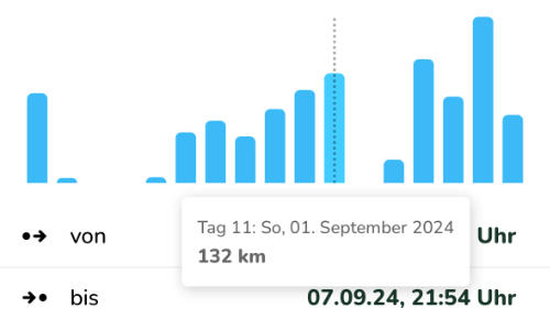 Unterhalb der Karte findest du ein Diagramm, das Standardmäßig die gefahrenen Kilometer pro Tag deiner Tour anzeigt. Fahre mit dem Finger über die Balken des Diagramms, um die genaue Kilometerzahl des betreffenden Tages zu sehen.