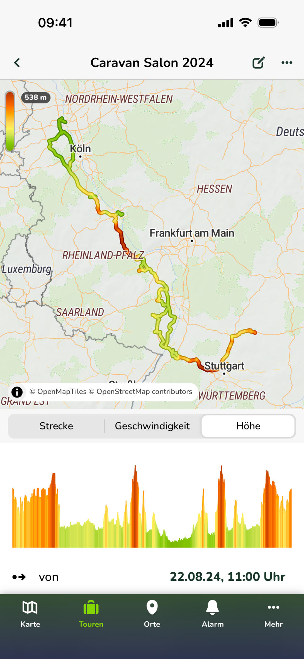 Durch das Tippen auf die Zeile "Übernachtungsplätze" werden die Übernachtungsplätze auf der Tour in der Karte angezeigt. Durch Tippen auf die Zeilen "Höchstgeschwindigkeit" und "Höchster Punkt" wird in der Karte die Position, an dem diese Werte aufgezeichnet wurden, angezeigt.