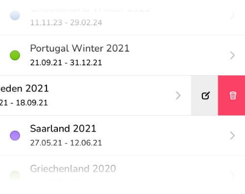 Wische in der Touren-Übersicht eine Tour, die du bearbeiten oder löschen willst, nach links. Es erscheinen zwei Schaltflächen am rechten Bildschirmrand.