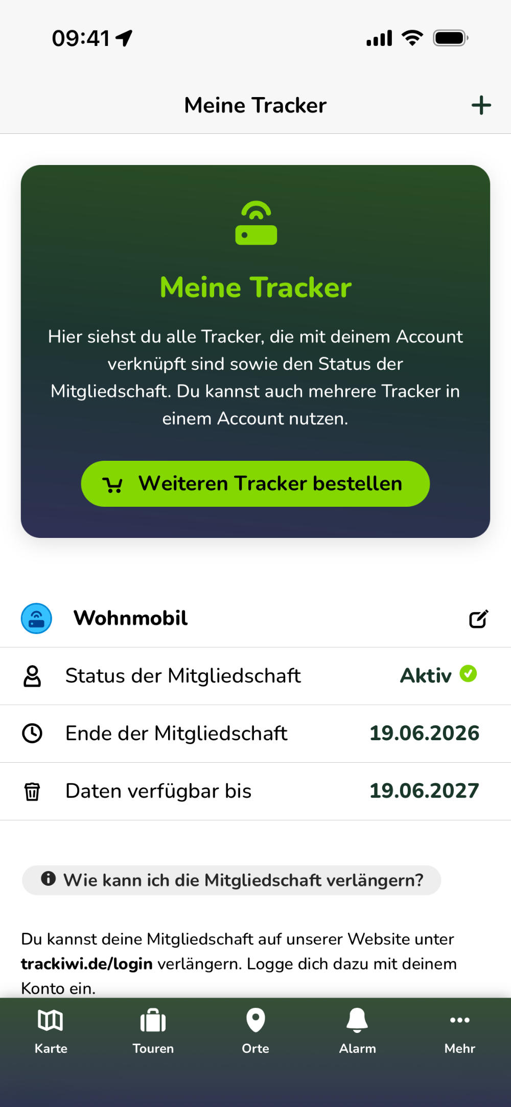 Du kannst mehrere Tracker in der trackiwi App gleichzeitig nutzen. Wenn du für ein weiteres Fahrzeug einen Tracker bestellen möchtest, tippe die "+"-Schaltfläche oder auf "Weiteren Tracker bestellen".