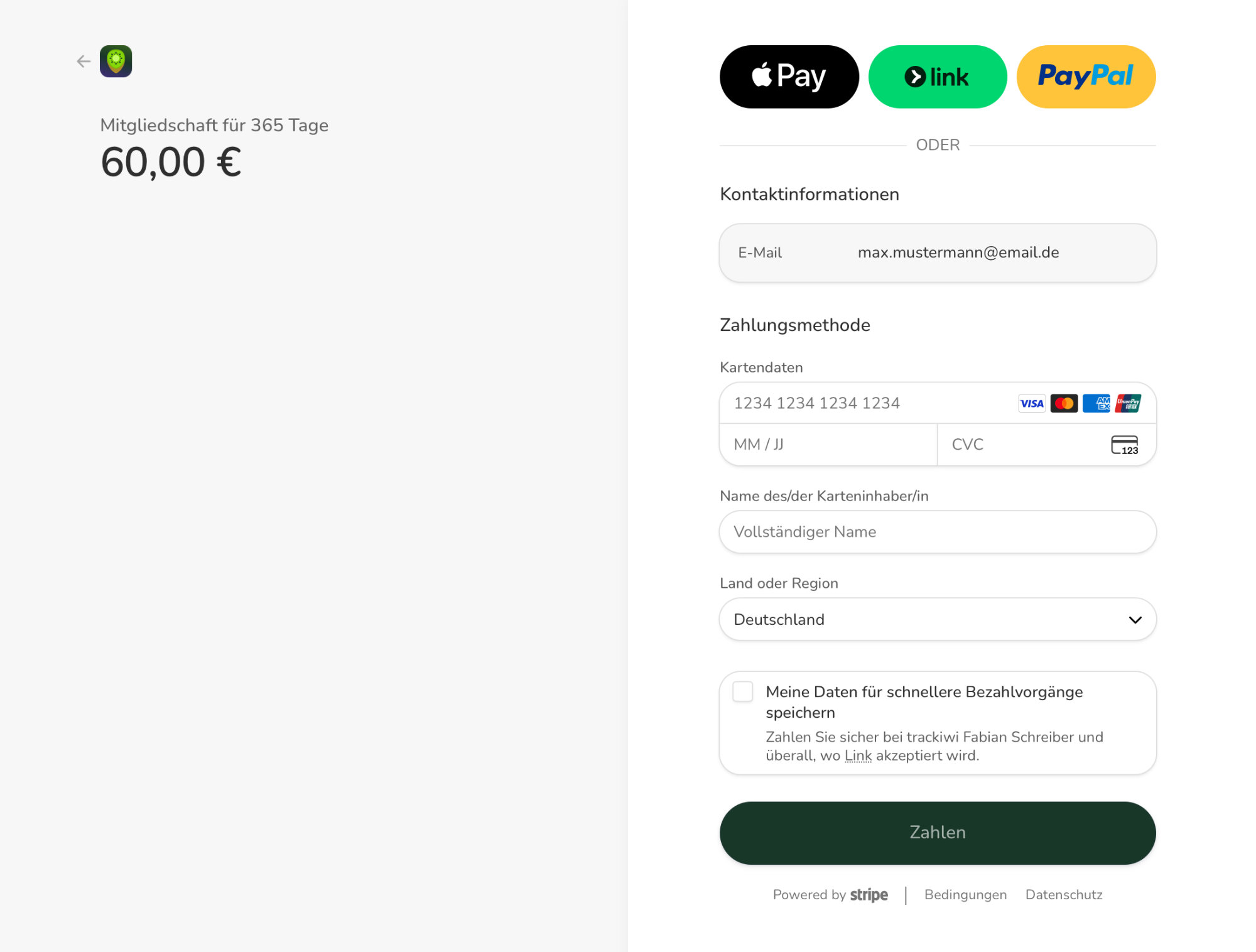 Du wirst nun zu unserem Zahlungsdienstleister Stripe weitergeleitet.