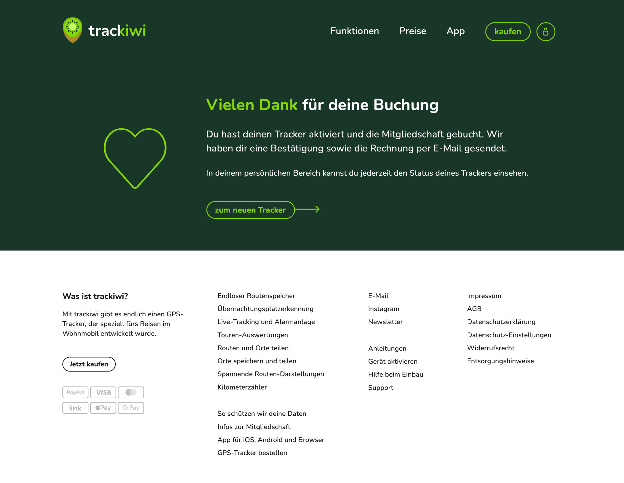 Wähle eine Zahlungsmethode aus und folge dem Bezahlprozess. Nach erfolgreichem Abschluss wirst du wieder auf die trackiwi Website zurück geleitet. Es wird dann folgende Bestätigungsseite angezeigt: