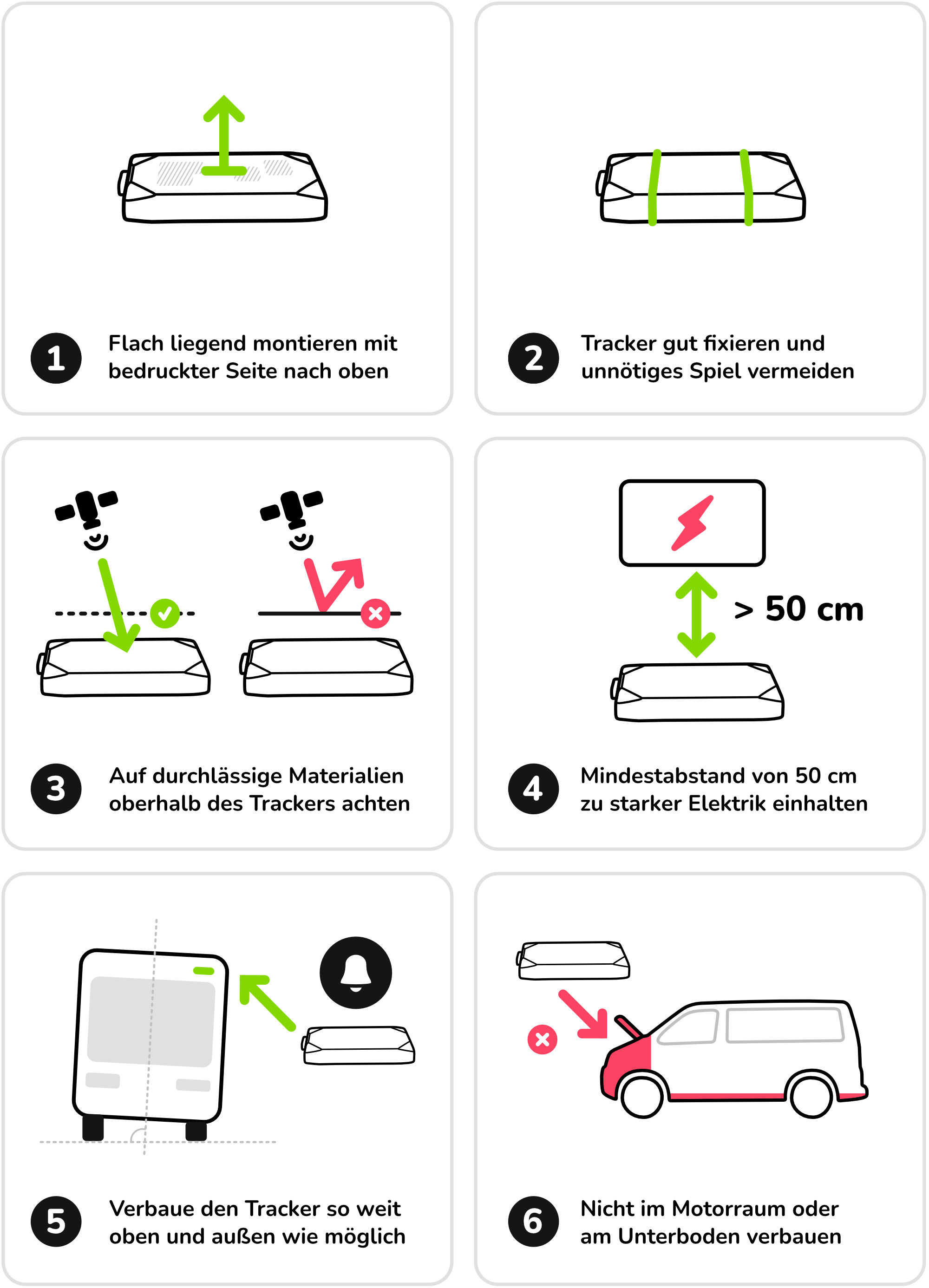 | Tracker findet kein Sigmal | Wenn die Bestätigungs-E-Mail nicht ankommt und der Tracker in der App nicht sichtbar ist, bringe den Tracker für einige Minuten unter offenen Himmel. Sollte er sich dort funktionieren, versuche den Einbau an einem anderen Ort. |