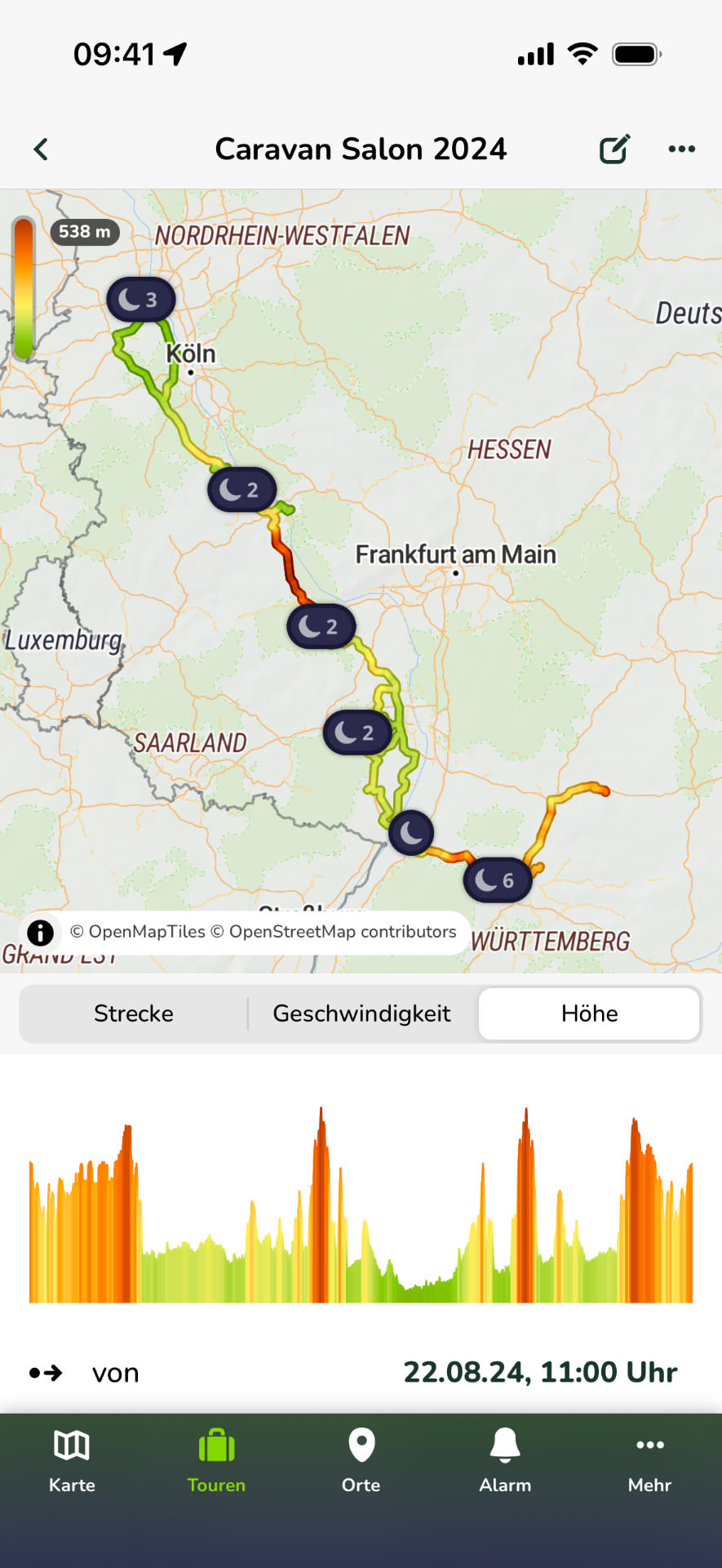 Die Route wird entsprechend der Höhenmeter mit einem Farbverlauf eingefärbt. So siehst du beispielsweise sofort, wo die geografischen Höhepunkte deiner Reise waren.